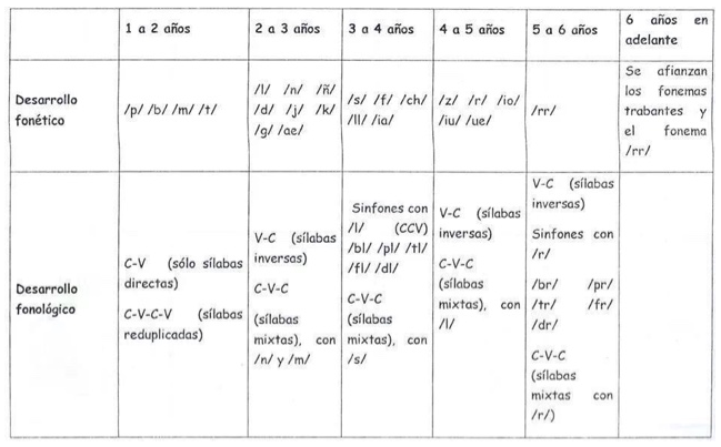 Por un lado, encontramos el desarrollo fonético, que se refiere a la articulación, las letras que se aprender a cada edad (menos las vocales aisladas, ya que en este caso suelen aparecer juegos vocalicos a las pocas semanas de vida).